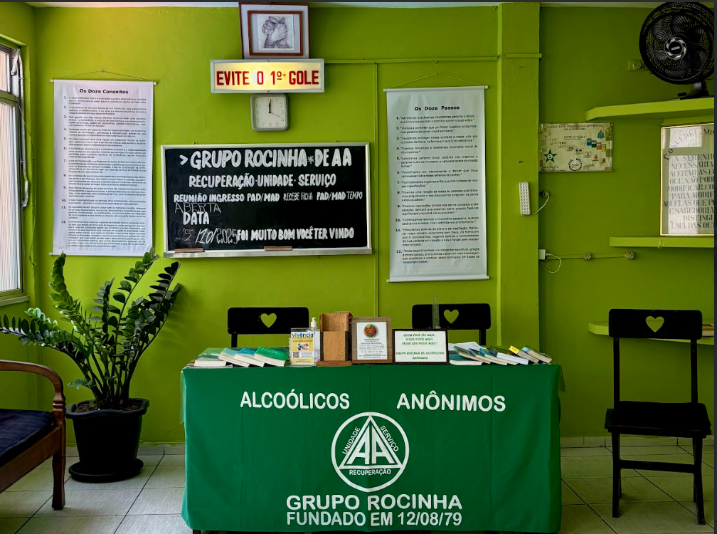 Histórias como as dele mostram um lado da Rocinha que nem sempre ganha visibilidade: o das pessoas que lutam diariamente para se libertar do alcoolismo. O Alcoólicos Anônimos (A.A.) é uma iniciativa não governamental que funciona a partir de um programa de 12 passos, que incentiva cada participante a reconhecer a impotência diante do álcool. Além disso, o grupo encoraja os membros a buscar apoio em um propósito maior, seja espiritual, coletivo ou simplesmente humano. As reuniões são gratuitas, abertas a qualquer pessoa que deseje parar de beber e se sustentam com doações voluntárias feitas pelos próprios participantes.