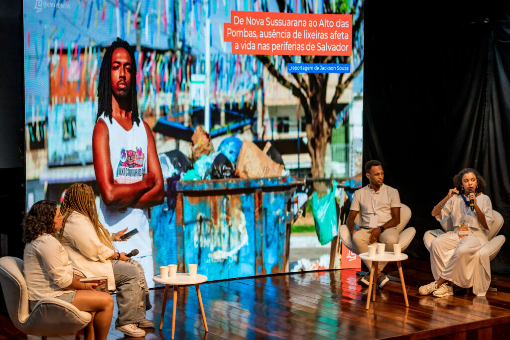 Inicialmente, o público acompanhou Brenda Gomes, coordenadora da Entre Becos, mídia local das periferias de Salvador. Ela listou pautas jornalísticas produzidas como a ausência de lixeiras em bairros periféricos da cidade e o impacto do racismo ambiental.