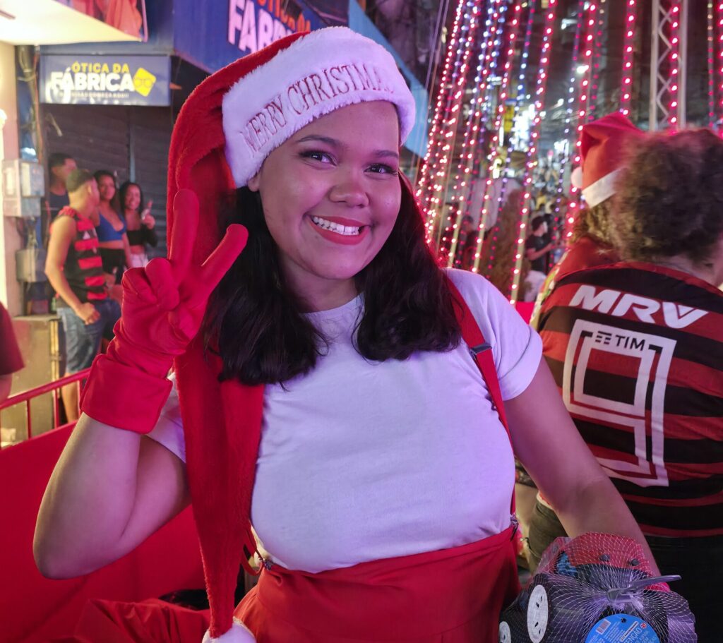 “Como Mamãe Noel, tive contato direto com crianças de todas as idades. Uma coisa em comum foi o encanto. Os olhos brilhavam e a excitação para explorar e tirar fotos eram grandes. Acredito que para muitas delas foi a primeira vez vendo tal estrutura e tendo a oportunidade de receber brinquedos”, conta Júlia Silva, 18 anos. Moradora da Rua Um e estudante de pedagogia, ela participou da entrega de presentes como Mamãe Noel.